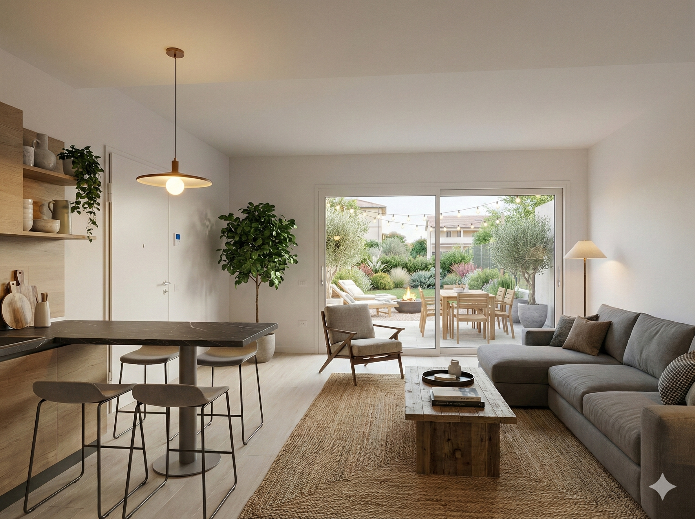 Le abitazioni si distinguono per ambienti luminosi, finiture curate e distribuzione funzionale: zona giorno con grandi vetrate, camere accoglienti, bagni moderni e terrazzi o giardini privati pensati per estendere lo spazio abitativo verso l’esterno.